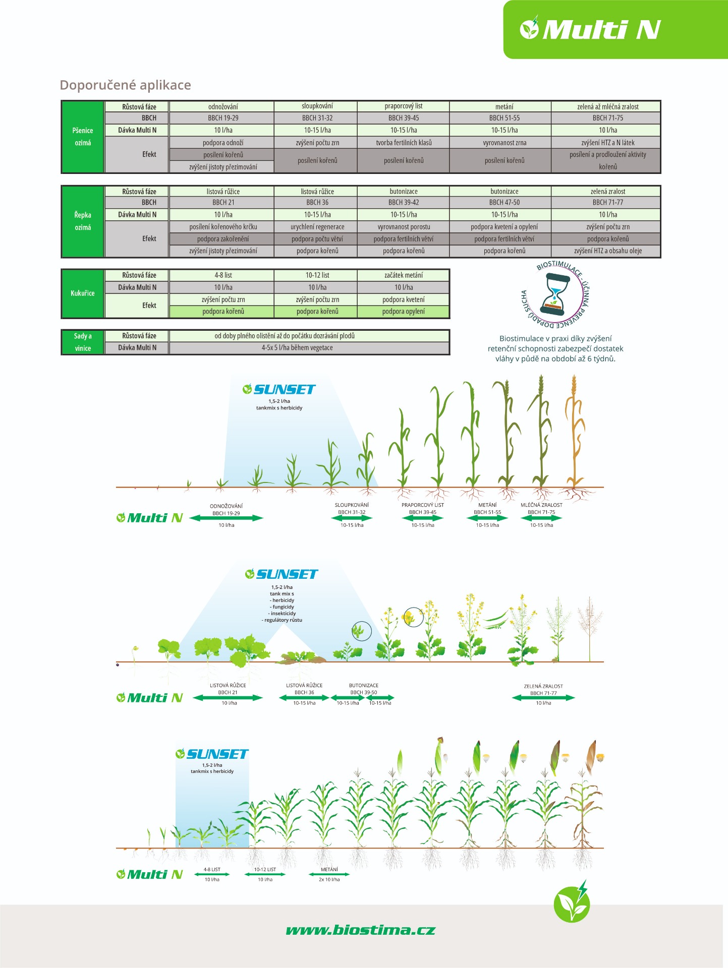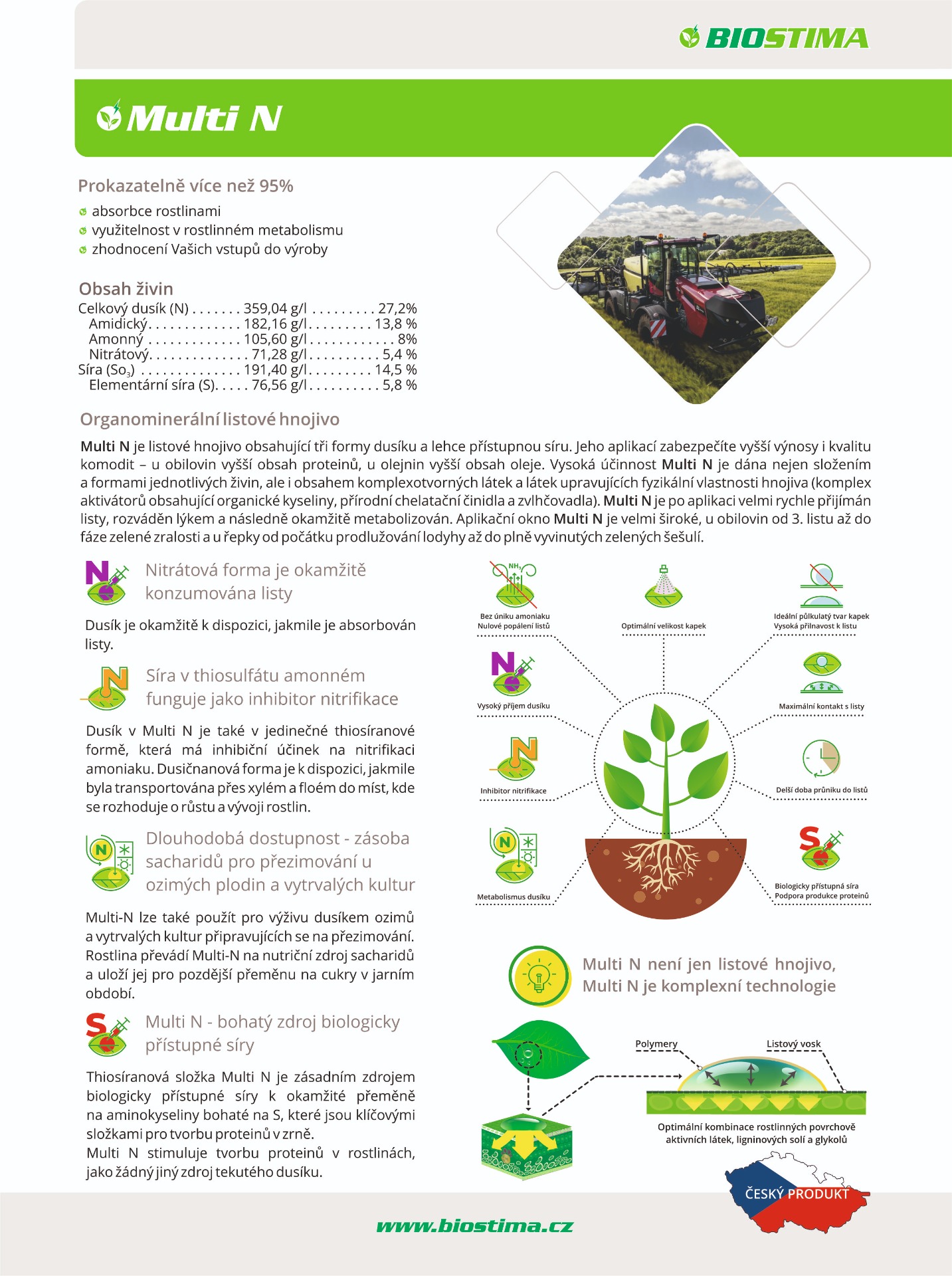 Multi N je listové hnojivo obsahující tři formy dusíku a lehce přístupnou síru. Jeho aplikací zabezpečíte vyšší výnosy i kvalitu komodit - u obilovin vyšší obsah proteinů, u olejnin vyšší obsah oleje. Vysoká účinnost Multi N je dána nejen složením a formami jednotlivých živin, ale i obsahem komplexotvorných látek a látek upravujících fyzikální vlastnosti hnojiva (komplex aktivátorů obsahující organické kyseliny, přírodní chelatační činidla a zvlhčovadla). Multi N je po aplikaci velmi rychle přijímán listy a následně okamžitě metabolizován. Aplikační okno Multi N je velmi široké, u obilovin od 3. listu až do fáze mléčné zralosti a u řepky od počátku prodlužování lodyhy až do plně vyvinutých zelených šešulí.