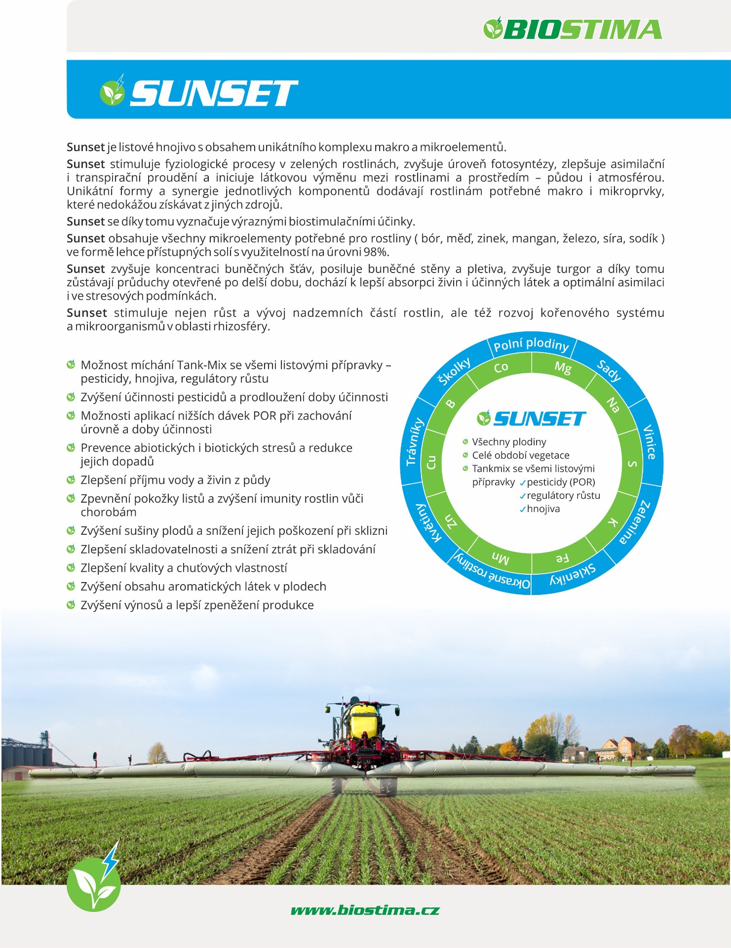 Sunset je listové hnojivo s obsahem unikátního komplexu makro a mikroelementů.